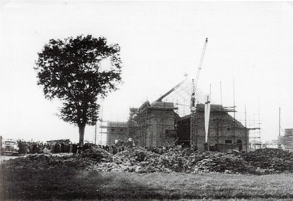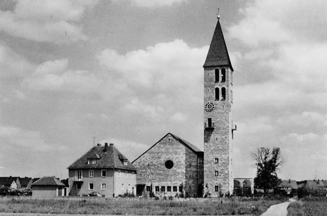 Das neue Gemeindezentrum aus Kirche, Pfarrhaus und Gemeindehaus plante der Nürnberger Architekt Max Kälberer. Am 18. Dezember 1954 wurde feierlich die Grundsteinlegung durchgeführt. Die Kirche wurde aus fränkischem Muschelkalk und Jurakalkstein gebaut. Durch den strengen Winter wuchs das neue Gotteshaus nur sehr langsam und verzögerte die Weihe. Das Richtfest konnte am 30. September 1955 gefeiert werden. Der Kirchturm war zunächst nur ein Stumpf, da die Gelder ausgingen.
