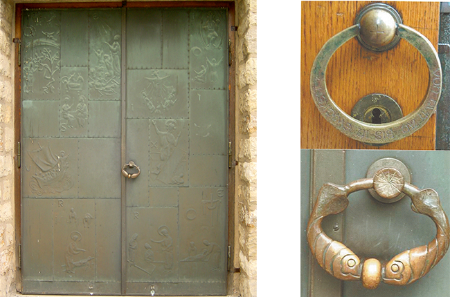 Das in mittelalterlicher Tradition gestaltete Kirchenportal ist eine Kupfertreibarbeit, die vom Kunsthauer Herbert Stern aus Altötting geschaffen wurde. Auf der Außenseite ist sie mit unterschiedlichen Bronzeplatten beschlagen. Auf zehn rechteckigen Tafeln zeigt sie verschiedene biblische Geschichten zu Sündenfall, der Geburt Christi, Szenen aus Jesu Leben, Grablegung, Auferstehung und Pfingsten bis hin zum jüngsten Gericht. Der Türknauf stammt ebenfalls von Herbert Stern. Auf dem Griff findet sich auf der einen Seite eingraviert die Inschrift "Der Herr behüte Deinen Ausgang und Eingang von nun an bis in Ewigkeit."