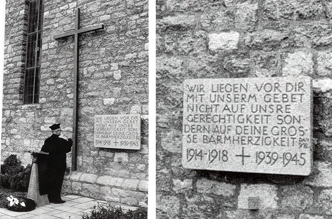 Am Kirchenschiff findet sich das Totengedenkmal, welches am 15. November 1964 durch Pfarrer Schwenk eingeweiht wurde. Die aus Muschelkalk geschaffene Tafel trägt die Inschrift "Wir liegen vor dir mit unserem Gebet (und vertrauen) nicht auf unsre Gerechtigkeit sondern auf deine große Barmherzigkeit." (Dan. 9,18) sowie die Jahreszahlen 1914-1918 und 1939-1945. Dahinter befindet sich das ehemalige Holzaltarkreuz, eingefasst in Kupfermantel.